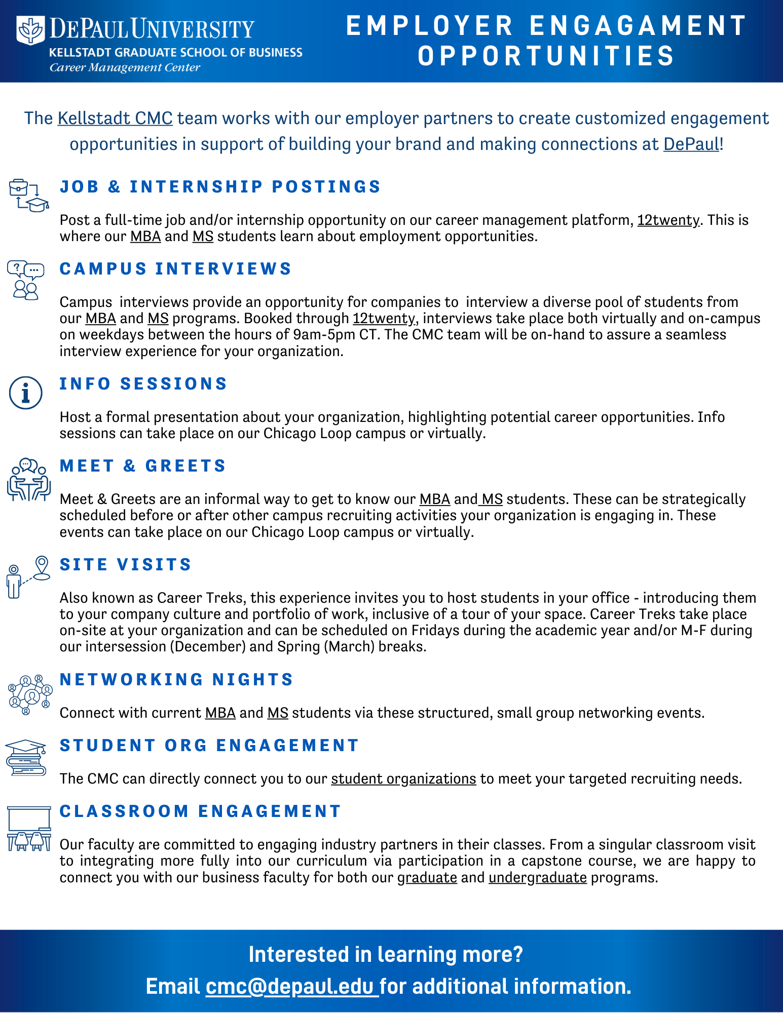 The CMC's recruiting policies provide guidelines for employers looking to recruit talent from the Kellstadt Graduate School of Business. Along with these policies, all individuals involved in recruiting from the DePaul University community are required to review and adhere to our university policies, all Federal and State Equal Employment Opportunity (EEO) and Labor Laws as well as the NACE Principles for the Ethical Professional Practices.