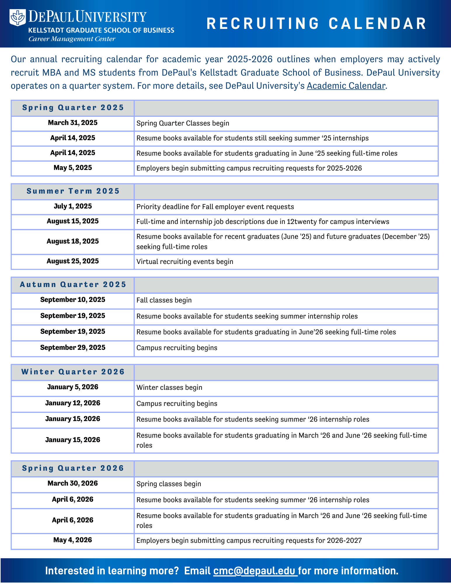 Our annual recruiting calendar for academic year 2025-2026 outlines when employers may actively recruit MBA and MS students from DePaul's Kellstadt Graduate School of Business.